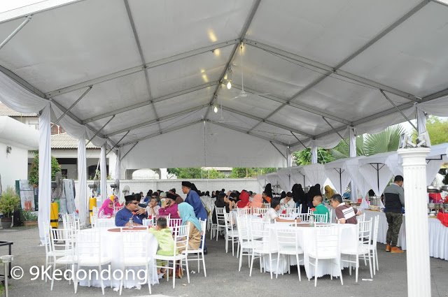 There are many bungalow units around that exclusive area in Ampang where 9Kedondong is located. Inside this white house, there is a big hall, the bridal suite and 2 other bedrooms, a spacious yard for you to set up tents for the wedding feast. The walkway is beautifully decorated in green lawn style and very clean. The concept of the main event space is simple and nice, mainly white, drapes on the ceiling and surrounding the event marquee. With the table/ chair arrangements and setting, it does look like an English garden wedding. Nonetheless you can discuss with the person in charge regarding your wedding theme and requirements if some customization can be made.