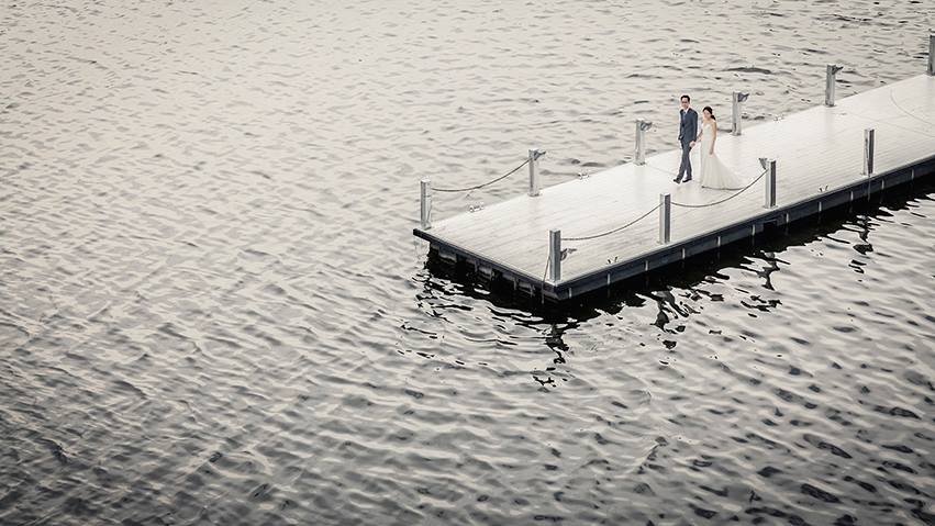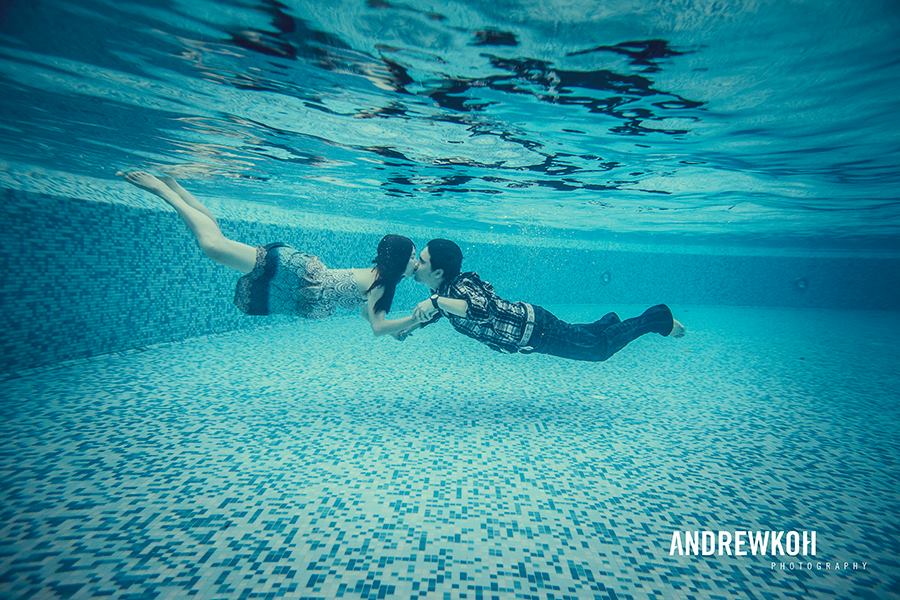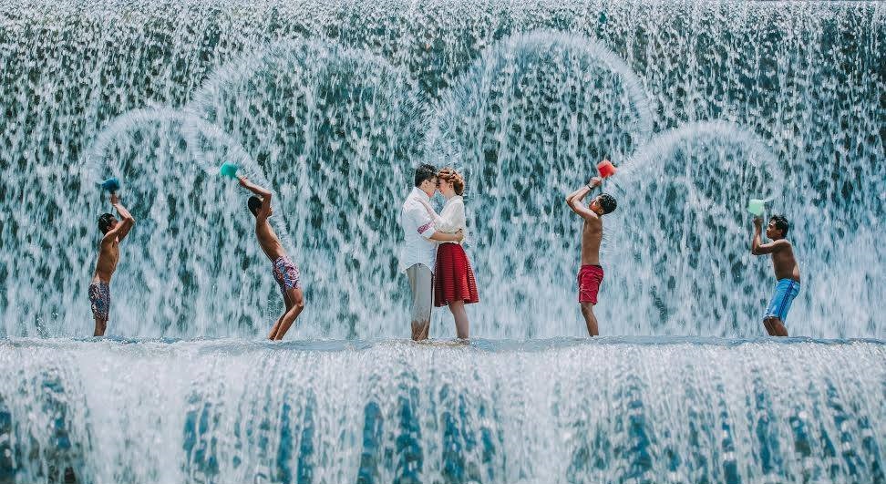 Water element: The couple stands out from the black and white background |