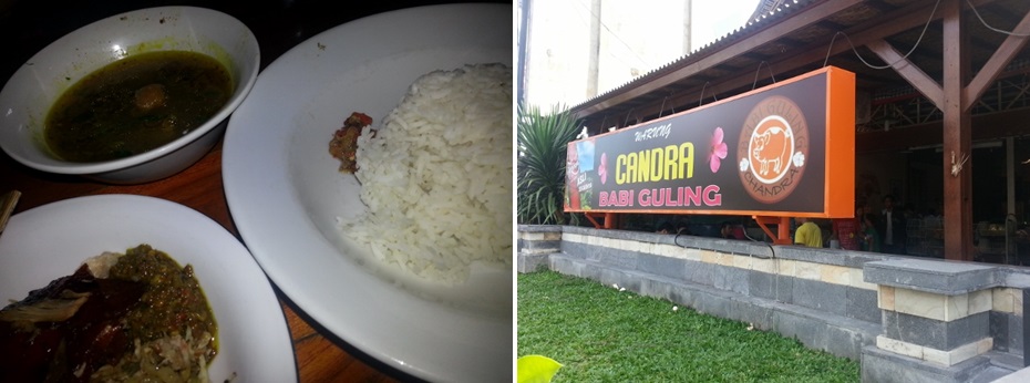 - Babi guling (roasted pig). Ibu Oka, Ubud (Reviews) is the most talked about warung (restaurant) for a taste of the Bali porky delight. While it may be popular among tourists, the locals prefer visiting other warungs for their babi guling. We had ours at Warung Candra (Reviews), Denpasar. The pork is very tasty especially the aromatic crispy skin. The soup so rich and yummy. Hubby loves the spicy side dishes to go with the pork and rice. The place is crowded, may have to share a table with other patrons during peak hours. Babi guling special + orange juice + teh botol + extra bowl of soup = IDR60K
