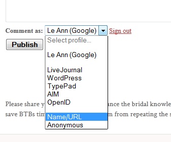 Earlier I urged visitors of WEDresearch to share their personal experience by commenting on the posts (Bridal Information Hub – Part 1). There are more and more people adding comments as “Anonymous”. Here’s a small request, would it be ok to provide a name or simply a nickname by selecting “Name/URL” at the “Comment as” section?