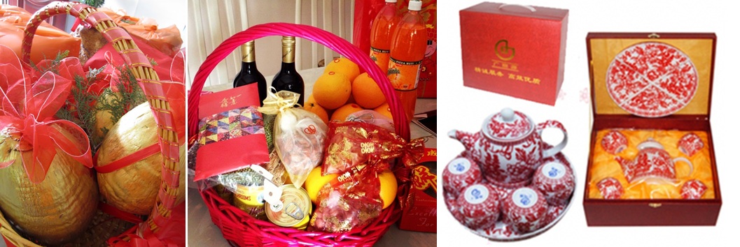 The groom would present the betrothal gift (“Guo Dai Lai”) to the woman’s family approximately one month before they get married. The significance of the color red in Chinese culture is that it brings luck and prosperity to the happy occasion. Here is an example of some content of the gift (which is mostly red or orange in color) for your reference, it varies with different Chinese dialect in Malaysia: