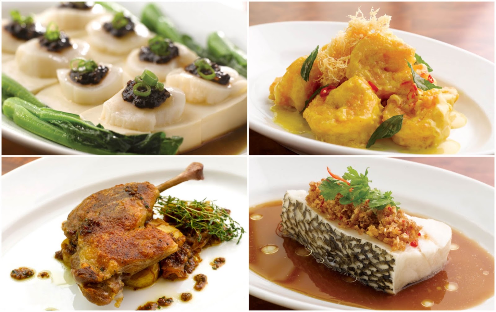 | Wedding menu: Steamed scallops Butter prawn with curry leaves Duck leg confit Steamed cod fish topped with crispy garlic and preserved vegetable |