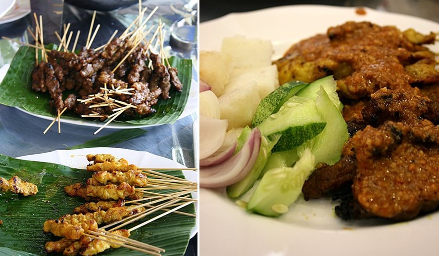 Left: Skewers of Chicken and beef satay being served. Right: Satay is to be eaten with peanut sauce, cucumber, onions and nasi impit (rice cubes) |