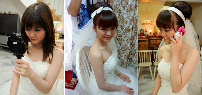 Chris is a freelance MUA (Wedding Acronym) based in KL. With an eye for details, she studies the requirement of her clients before proceeding. Unlike certain MUAs who cannot even remember the sample styles shown to them before. I think her skill is in using color tones to make the bride’s distinctive attributes stand out in a balanced way. I’m amazed at how different the girls look after makeup, while scrutinizing them closely, those are the same set of eyes, nose, mouth and face. She would enlarge the eyes, trim the chin and lift the cheek if required to create more perfect look, at least in accordance to the trend of our society today. This of course is done with pigment & brush, will be gone after a wash.