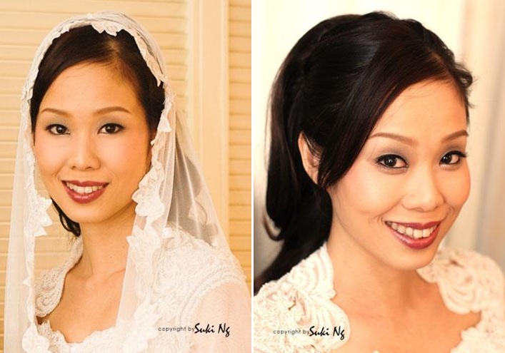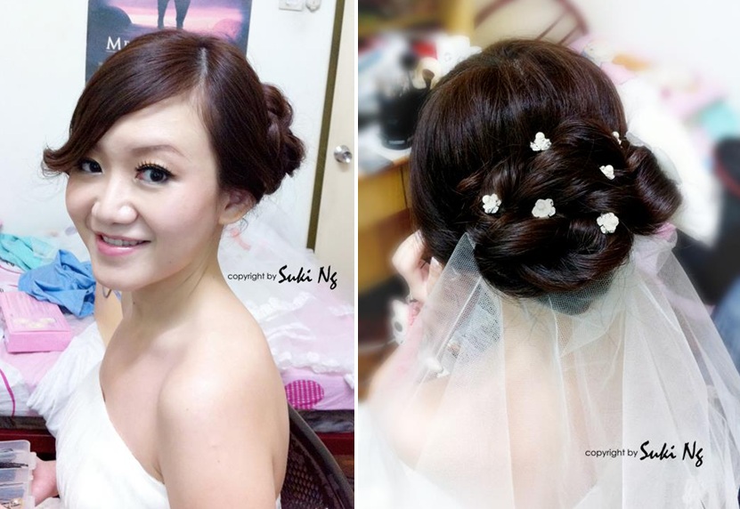 I am very excited to read such detailed description about how good Suki Ng is. On top of that, the satisfied ladies also uploaded photos of their bridal look to convince other BTBs (Wedding Acronym) they were not lying. Miss Ng’s portfolio is indeed impressive. Every bride wants to show off her best assets on the wedding day. Some girls look prettier with their hair tied up to exhibit the nice facial shape, eye bags properly camouflaged to accent the big but puffy eyes, or nose reduced with color toning to match a relatively smaller face. Suki can make your wish come true.