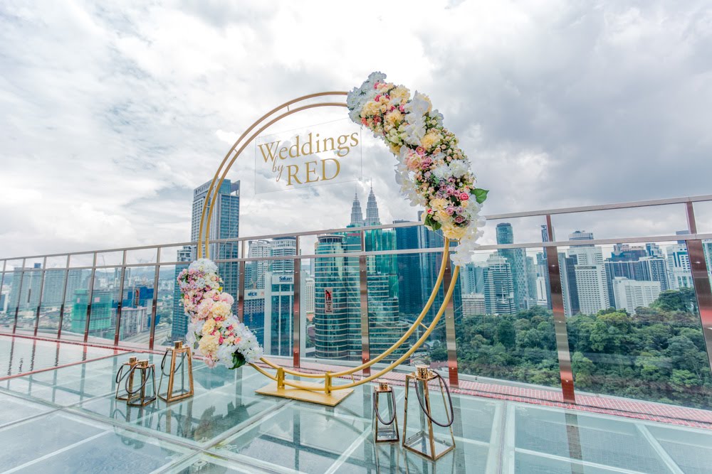The rooftop transparent platform for a momentous wedding ceremony witnessed by the sleek and graceful KL Tower Credits– Decoration: Tailored Asia | Photography: My Dream Wedding |