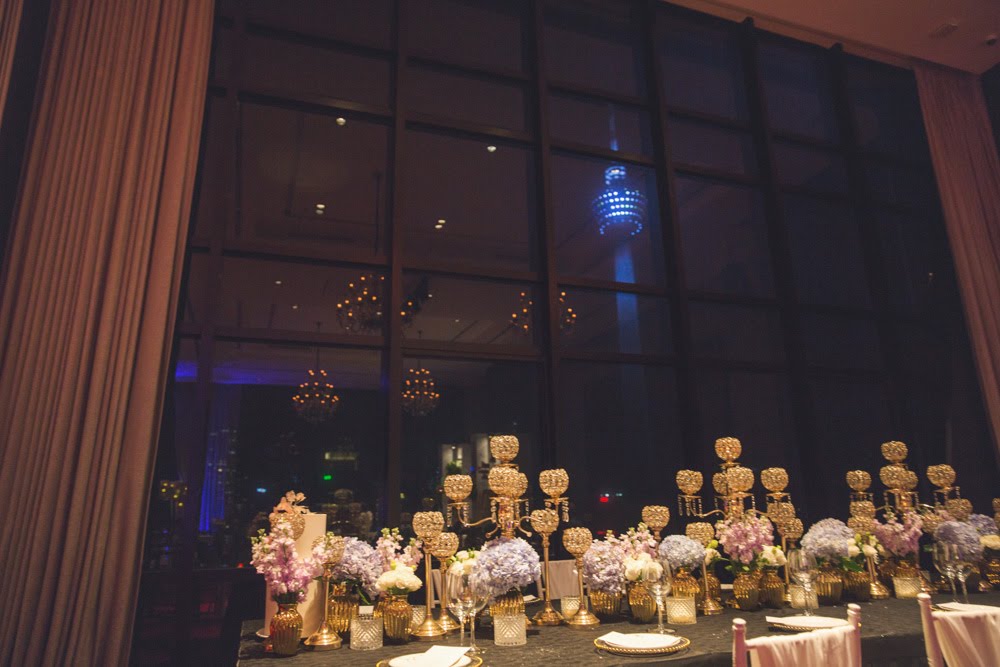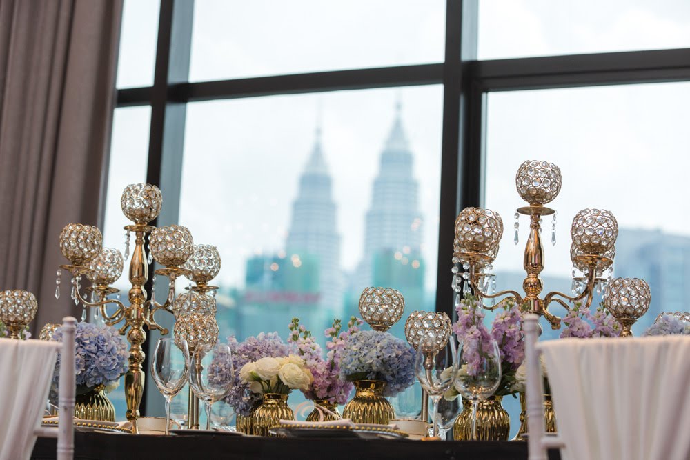 Full height glass paneling provides plenty of natural day light and offers good visibility of the greater KL city and its vibrancy. Credits– Decoration: Tailored Asia | Photography: My Dream Wedding |