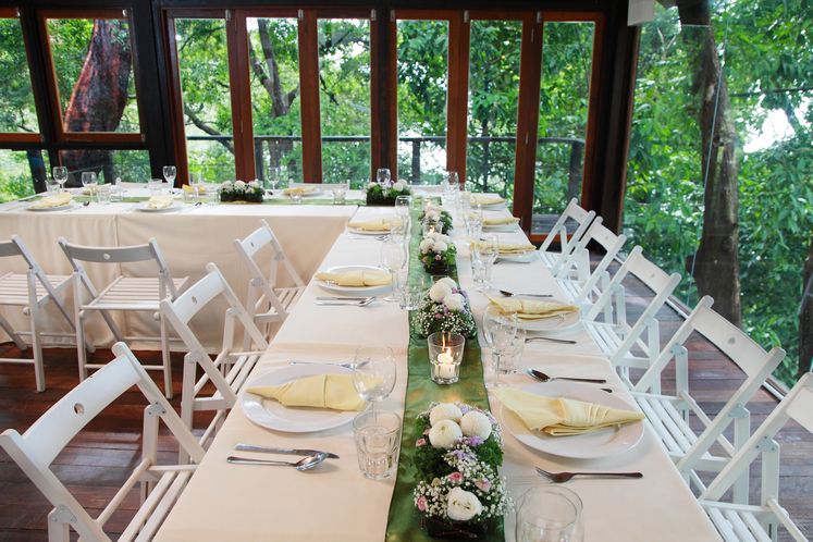 The Pavilion makes dining in the jungle an experience! Rustic rattan and wood fittings in the covered air-conditioned Pavilion offer guests an opportunity to dine in cool comfort while enjoying the vast expanse of greenery on the outside.