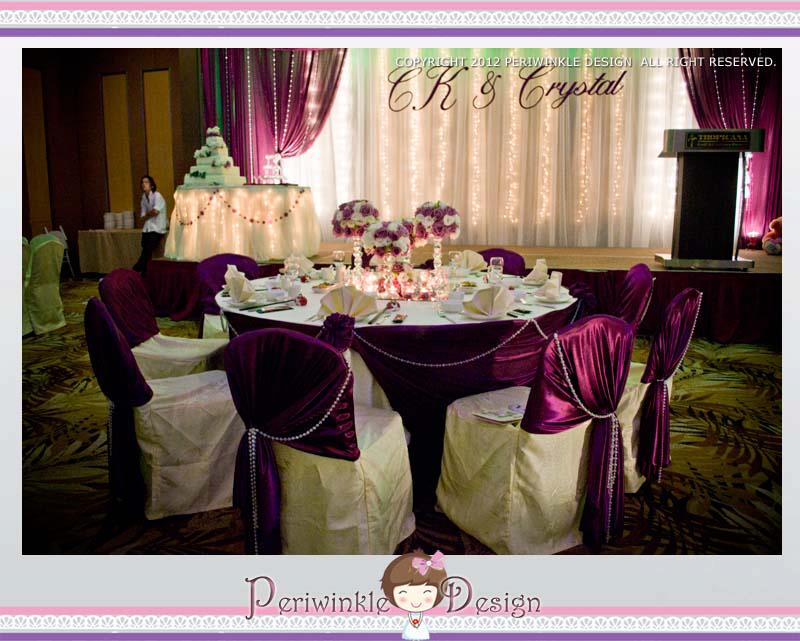 theme personal to them and their love adventure for instance. Periwinkle provides decoration services that can be customized according to the concept developed by the customer. The pictures below show how extensive is their overall decor, very well thought of indeed. From the reception table to the ballroom stage, every detail is carefully crafted to produce the atmosphere desired by the bride and groom.