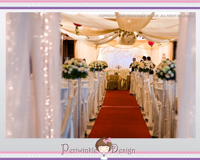 thumbs-up for them, they had actually provided me what they promised, and I can feel their passion to help making every bride dream comes true. Before engaging them, we had met up and Karen from Periwinkle, gathering information & preference from me. Being a fussy customer, I had requested few times of design theme options, and being a patient decorator, Karen actually revised her design few times to fit my requirement, yes even without deposit placed. After engaging them, we had proceed to details discussion, and they really jotted down every single requirement, and tried to customize & compromise, they even re-design a arch just to fit my wedding theme, and hey, they actually changed twice of the chair ribbon just because I don’t feel the colour is “champagne” enough. For those who are interested, here is their facebook page: https://www.facebook.com/pages/Periwinkle-D…126258924067367. |