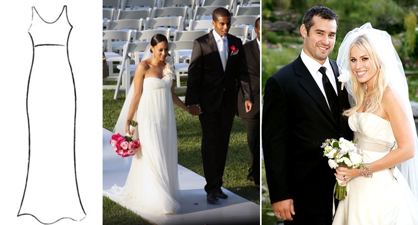 Kate Moss was hitched in a sheath dress created by her friend John Galliano. The V-neck, lace-embellished back, sheath wedding dress worn by Bella Swan (Kristen Stewart) in “Twilight – Breaking Dawn Part 1” was made by Carolina Herrera.